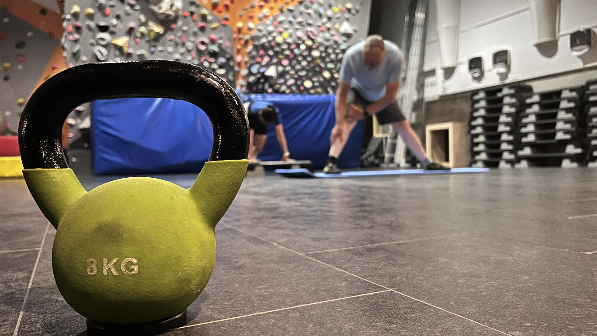 Jumppasalin perällä on kiipeilyseinä, jossa voit treenailla boulderointia.